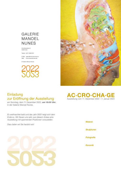 Der Kölner Galerist und Kurator Manoel Nunes lud zu einer Ausstellung aus der jeweils zum Jahreswechsel stattfindenen AC·CRO·CHA·GE-Reihe ein.